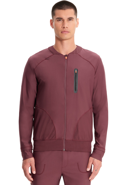 Supreme comfort without sacrificing professionalism. This knit men's scrub jacket features a stylized flat collar with mesh overlay and full front zipper. There are a total of six pockets for organized storage: one chest pocket with vertical zipper, two side seam zipper pockets, and three pockets inside the jacket. Contrast colored rubber-tipped zipper pulls for easier grip. There are sporty shaped front and center back panels plus curved front and back yokes for fit and style. Mesh overlay on front and back panels, bottom hem, and storm cuffs. Bungee ID badge loop on wearer¿s right shoulder seam. Coverstitched seams for added detailing. Men's Contemporary Slim fit. Center back length (size Medium): 26" IN322A