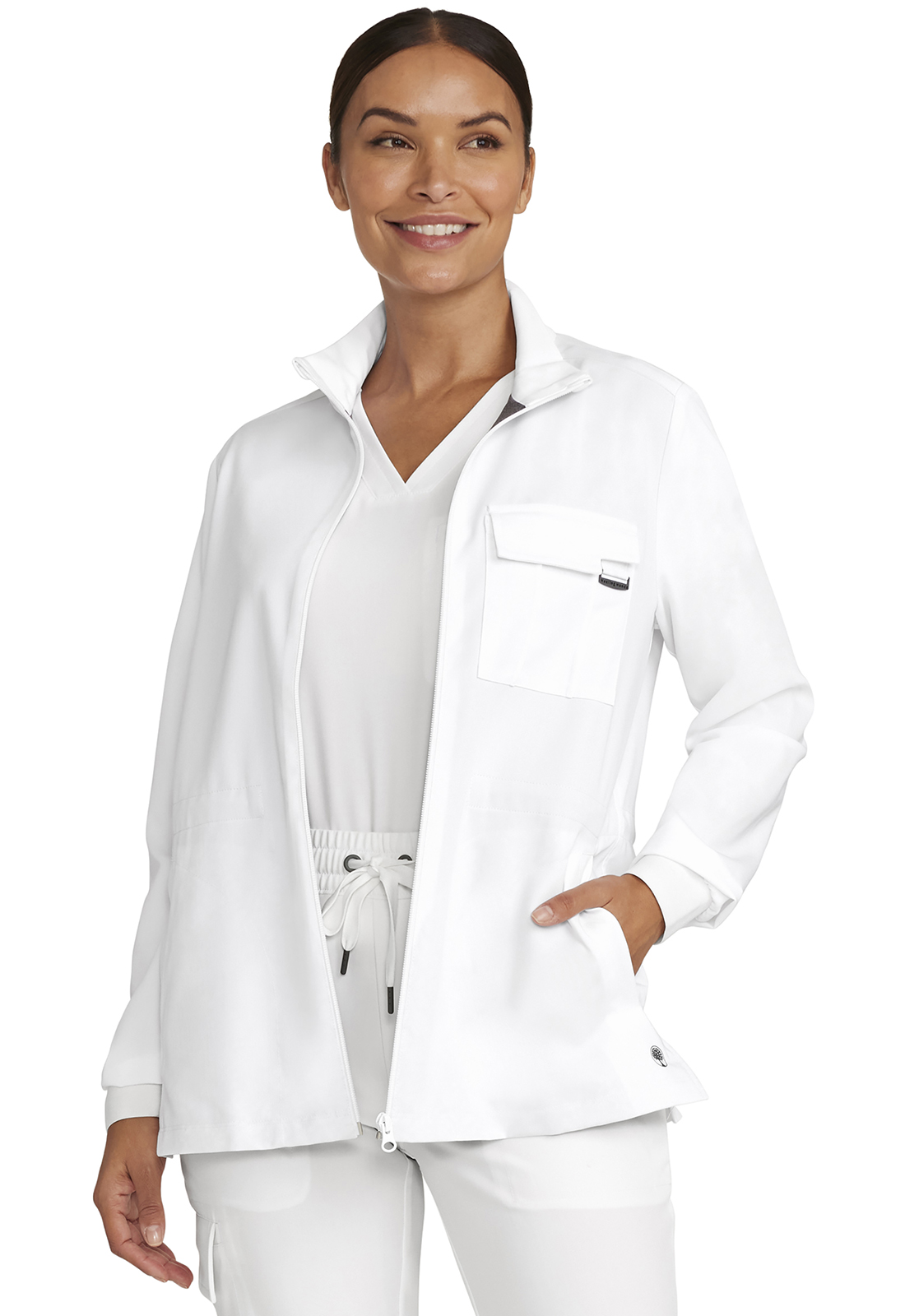 Perfect for work-to-weekend wear, the Brooks zip front jacket boasts exceptional design details. There is a logo zipper pull, stand-up collar, grosgrain ribbon trim on the shoulder seams, and patterned elastic sleeve cuffs. This utility jacket is partially lined with knit on the inside front and back yoke to guard against cool days and chilly hospitals. There are four pockets for stylish storage: one pintucked chest pocket with flap and logo D-ring, two front welt pockets, and one cell pocket on the inside left. Exterior pockets have pretty printed pocket bags. Adjust the waist using the bungee cord and toggles for a customizable fit. The curved back yoke provides a better fit across the shoulders. Side vents at hem for ease of movement. The soft four-way stretch fabric includes moisture wicking for added comfort. Modern fit. Center back length (size Small): 26" HH360